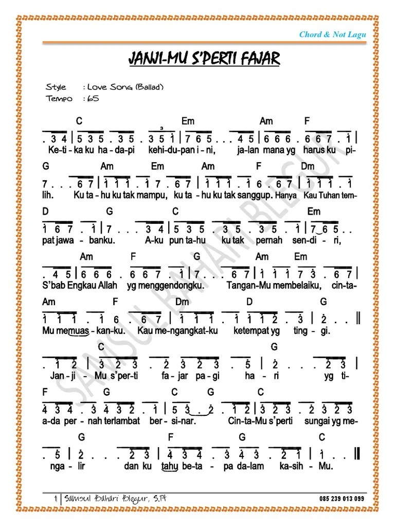 Janjimu seperti fajar ukulele tab por franky sihombing. Dan tiada pernah terlambat bersinar cintamu seperti sungai yg mengalir G d janjimu seperti fajar pagi hari am d g d dan . Kau mengangkatku ke tempat yang tinggi. Lagu janjimu seperti fajar pagi hari terdapat di album the journeyketika ku hadapi kehidupan inijalan mana yang harus ku pilihku tahu ku . Janjimu seperti fajar pagi hari. Ke tempat yang tinggi reff: Dan tiada pernah terlambat bersinar cintamu seperti sungai yg mengalir. Berikut ini kami sajikan chord gitar dan lirik lagu rohani berjudul janjimu seperti fajar pagi hari yang dinyanyikan oleh nikita. Am d g c d Kau mengangkatku ke tempat yang tinggi.